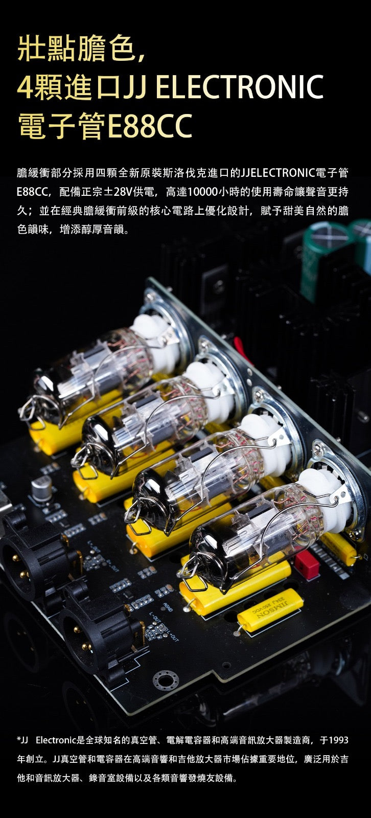 膽緩衝部分採用四顆全新原裝斯洛伐克進口的JJELECTRONIC電子管E88CC,配備正宗±28V供電,高達10000小時的使用壽命讓聲音更持久;並在經典膽緩衝前級的核心電路上優化設計,賦予甜美自然的膽色韻味,增添醇厚音韻。
